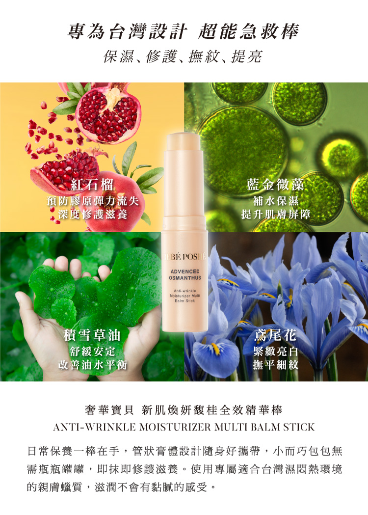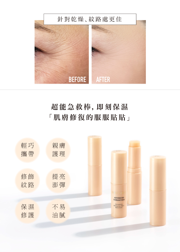 日常保養一棒在手,將馥桂油濃縮成管狀膏體設計,小巧隨身好攜帶。使用專屬適合台灣濕悶熱環境的親膚蠟質,隨即抹即修護,滋潤不會有黏膩的感受。