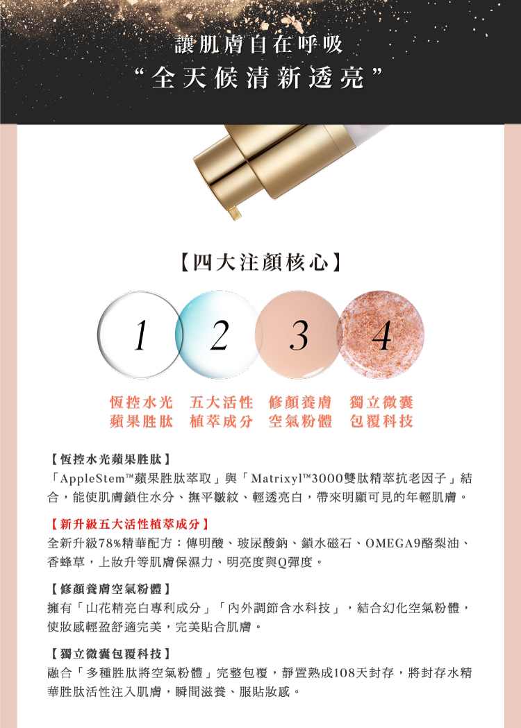 全新78%水感精華液+升級5大新修復成分:傳明酸、玻尿酸鈉、酪梨油、香蜂草、鎖水磁石,從上妝的那一刻就提供肌膚大量保濕與修復,賦予肌膚全天候自在呼吸的清新透亮裸肌妝感。