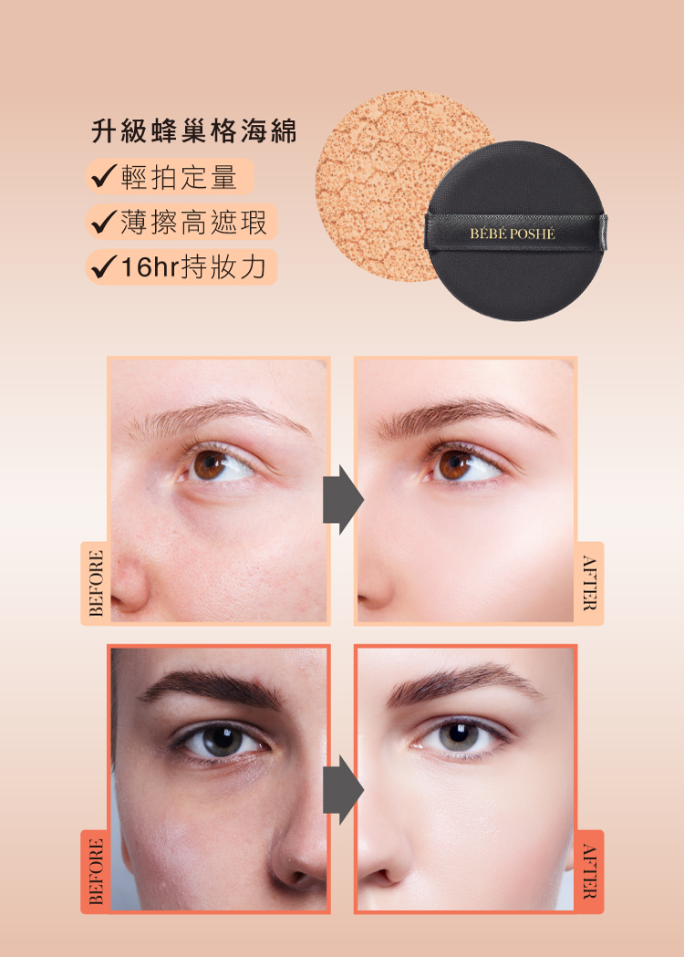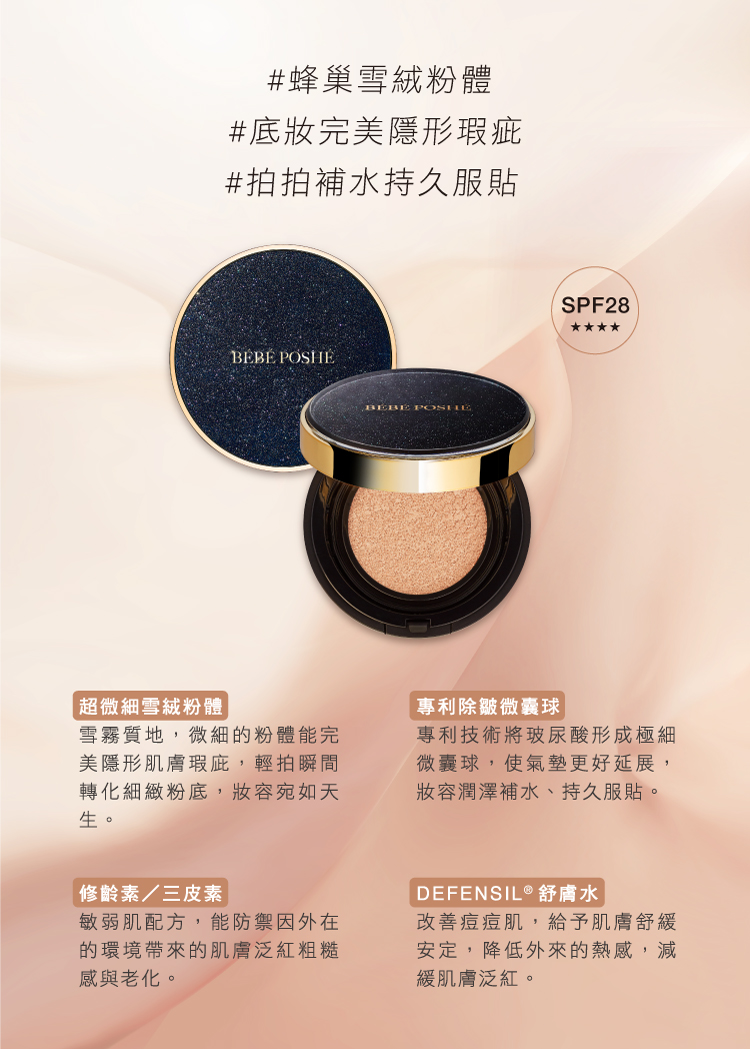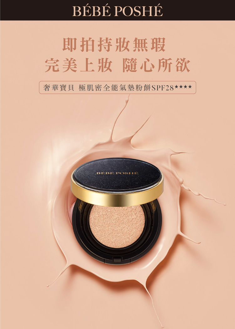 BÉBÉ POSHÉ極肌密全能氣墊粉餅,獨特仿生雲母與柔緞光感粉體,修飾肌膚毛孔、泛紅、暗沉,輕拍水嫩完美無瑕打造光滑亮澤肌膚。含有物理性防曬SPF28可有效預防UVA及UVB。