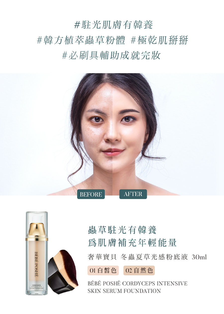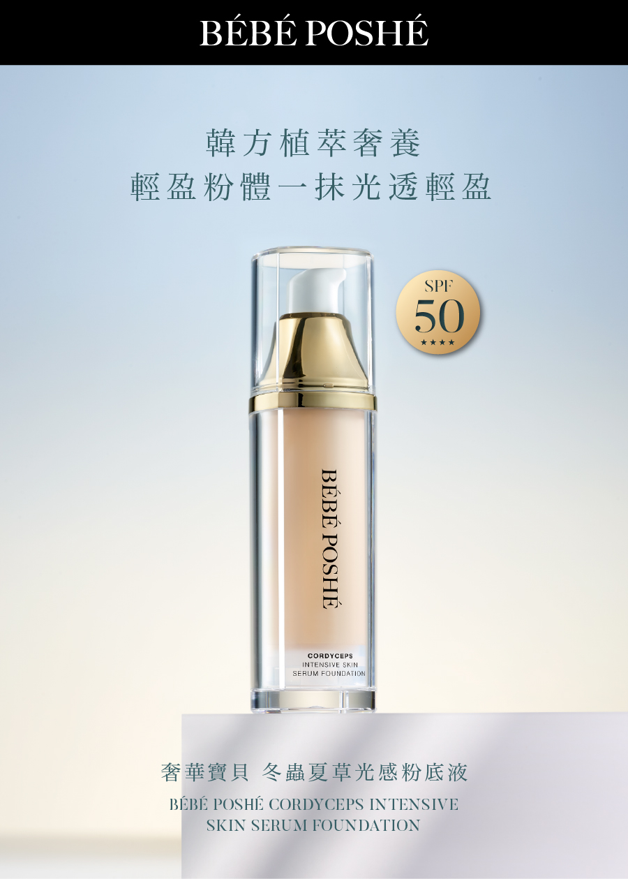 Using BÉBÉ POSHÉ cordyceps intensive skin serumfoundation can provide whatskin cells need more directly, the polysaccharide incordycepssinensis improve skin’s immune system. Protecting skin from daily lifedamage, reformingskin network.